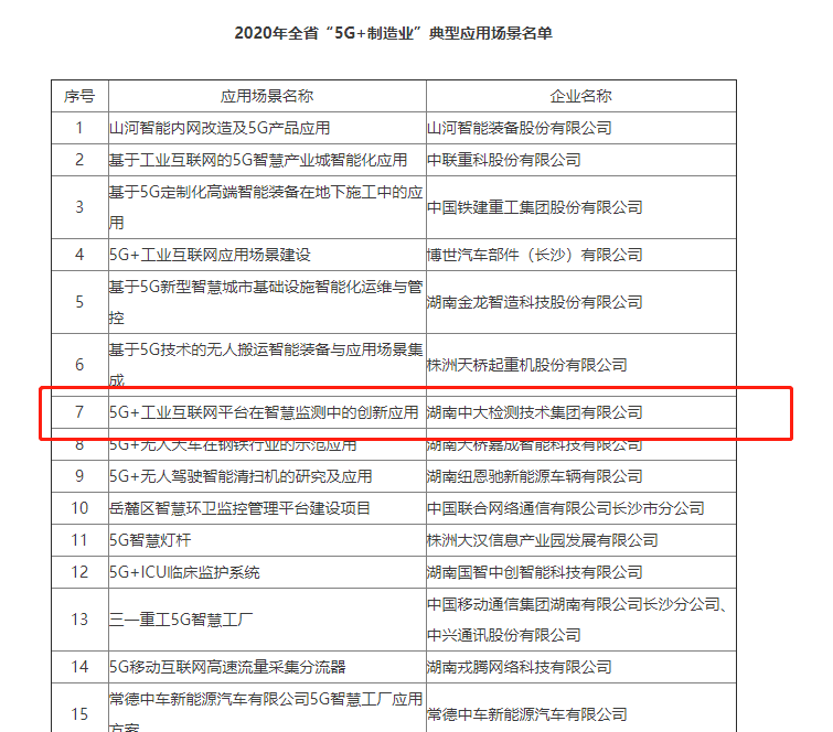 2020年12月14日,经企业申报、市州推荐和专家评审等环节,湖南省工信厅遴选出30个2020年全省“5G+制造业”典型应用场景,中大检测《5G+工业互联网平台在智慧监测中的创新应用》榜上有名。