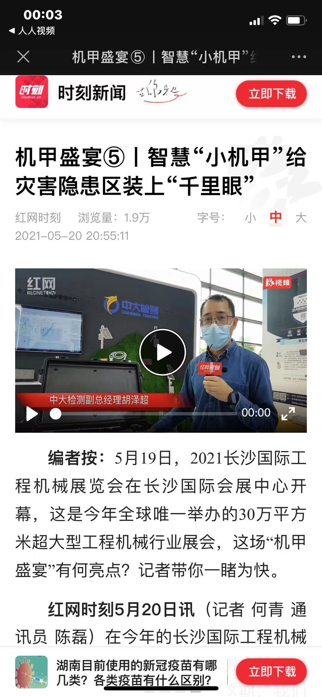 这次展览,中大检测此次为广大观众带来了地质灾害监测预警解决方案(实景模型+系统演示+传感器+北斗高精度GNSS+一体机+5G智能终端)、第一代K波雷达(2019长沙工程机械展获奖产品)和第二代区域微变雷达(工信厅《揭榜挂帅》项目)以及尾矿库管理解决方案,获得红网时刻/学习强国等媒体关注: