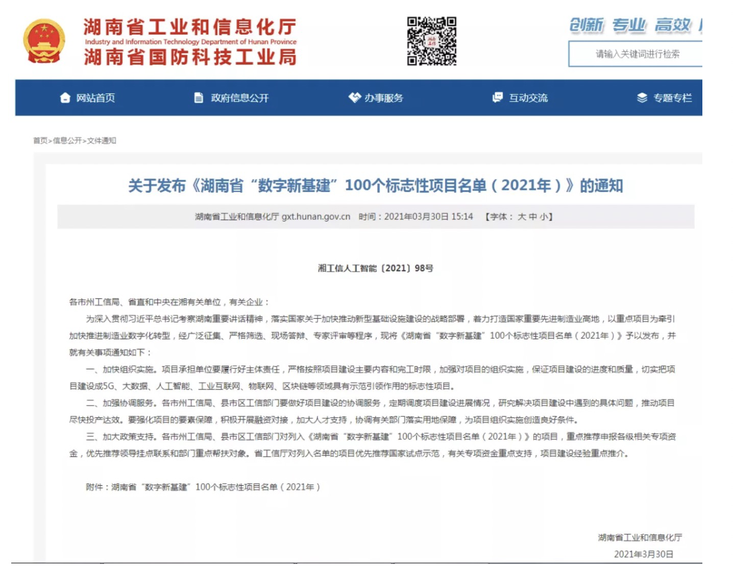 《湖南省“数字新基建”100个标志性项目名单(2021年)》