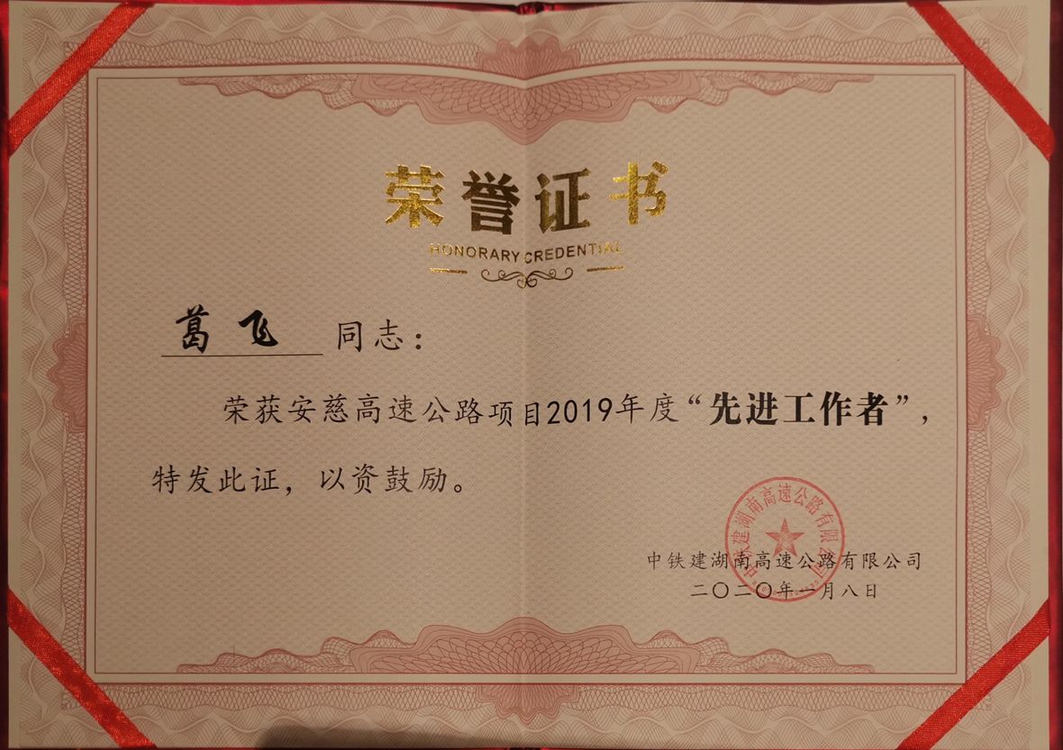 集团隧道与地基事业部葛飞荣获安慈高速公路项目2019年度 “先进工作者”称号