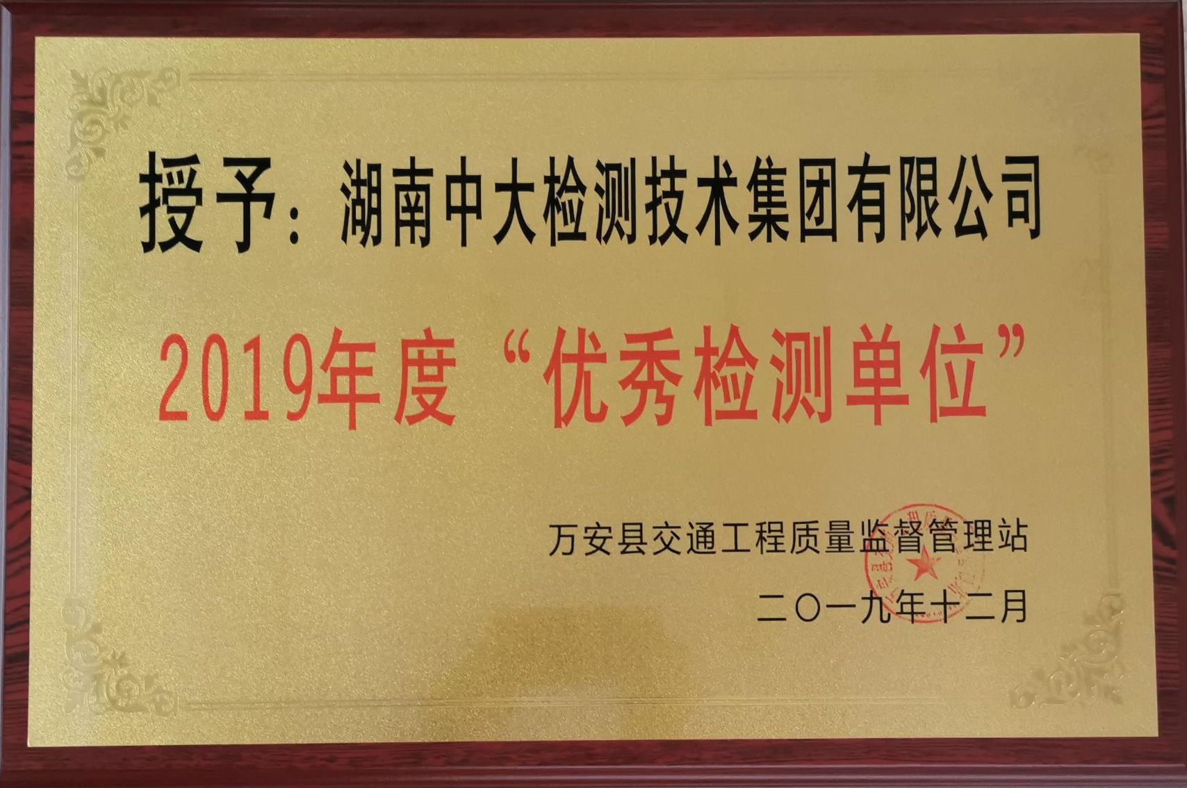 近日,江西万安县交通工程质量监督管理站向集团公司授予了2019年度“优秀检测单位”的荣誉称号,公司已连续两年荣获此项荣誉。公司承接的万安县交通重点建设工程第三方工程质量监督检测服务包括G356湄洲至西昌公路万安县石塘至芙蓉镇公路改建工程 、万安县县道百嘉至高陂段升级改造工程等多项万安县系列重点工程的质量监督检测服务。中大团队在工作中表现出了优秀的专业技术能力和服务素养,赢得了业主单位的高度好评。