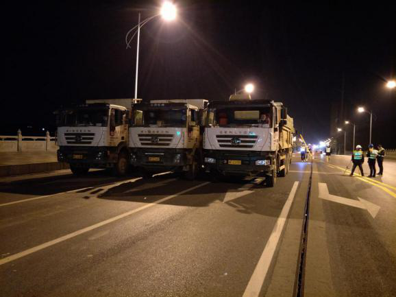 借着灯光,同事们分工合作,借助对讲机指挥着加载车辆,使用高精度数字式水准仪采集挠度、使用高灵敏度的静态应变仪采集应变,一切都井然有序配合默契。在紧张忙碌了6个小时后,大家完成了荷载试验,大伙神情带着疲惫,但更多的是圆满完成试验的成就感。他们深知,检测不仅仅要以规范为依据,也要用数据来说话,只有大家同心协力做好每一个环节才能达到检测的准确。