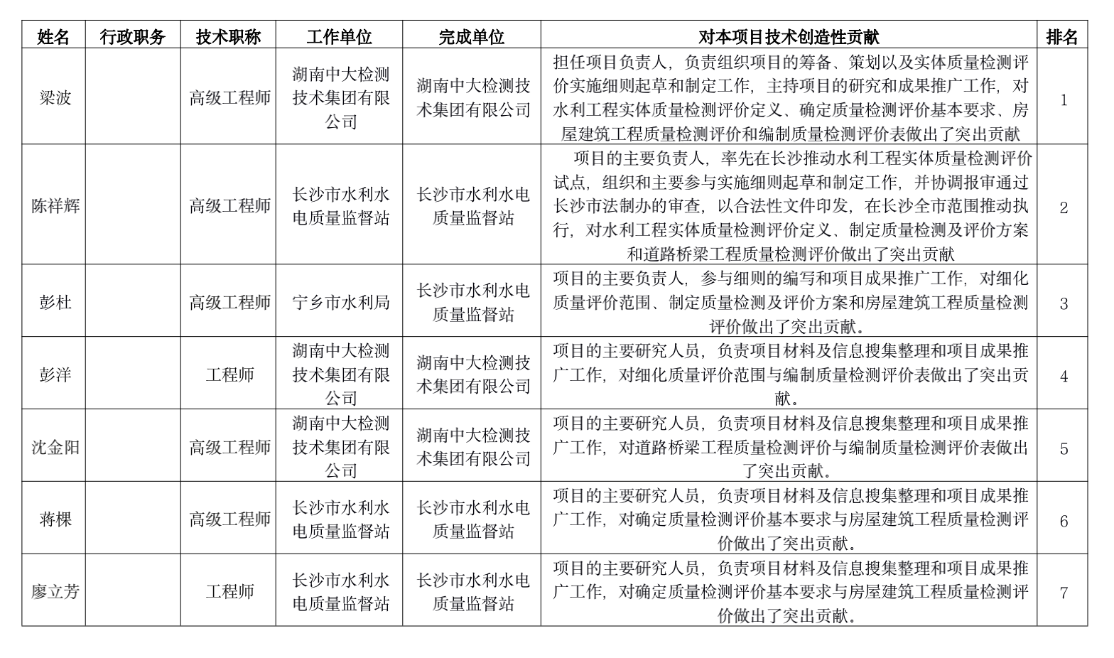 在《长沙地区水利工程实体质量检测评价管理体系应用推广》项目研究中,本人梁波与第二完成人陈祥辉完成水利工程实体质量评价定义工作,与第六完成人蒋棵共同确定质量检测评价基本要求,与第三完成人彭杜和第六完成人蒋棵承担房屋建筑工程质量检测评价标准的制定,与第四完成人彭洋和第五完成人沈金阳合作编制水利工程质量检测评价表。