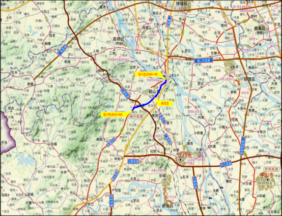 国道 G325 线鹤山大雁山至桃源段改线工程路线起点在沙坪镇黄宝坑南侧附近对接接国道G325 线,起点桩号为 K40+180,路线跨越大雁山互通立交后,沿佛开高速公路西北侧南行,与雁五线相交后前行下穿江门大道鹤山连接线,继续前行与江沙公路相交后从鹤山碧桂园南侧经过,路线转而向西南侧前行,下穿广珠铁路及江肇高速公路,经桃源镇,上跨既有国道 G325 后,终点止于桃源镇旺龙村附近, 接既有国道 G325 线,终点桩号为 K53+460,对应旧国道 G325 线桩号为 GK54+410,路线方案全长 13.28km。技术标准采用一级公路双向八车道标准,设计速度为80km/h。