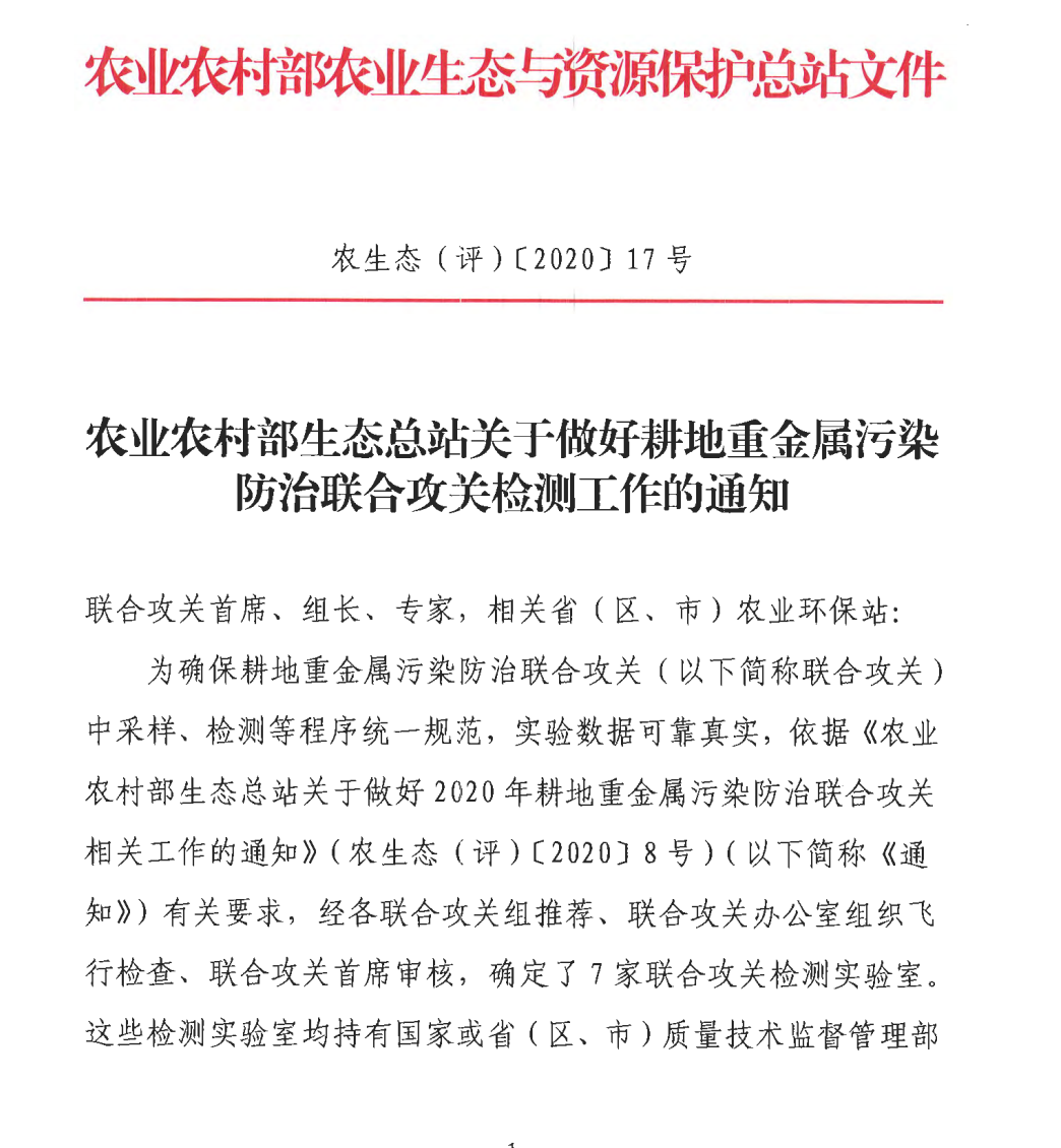 为确保耕地重金属污染防治联合攻关中釆样、检测等程序统一规范,实验数据可靠真实,6月23日,依据《农业农村部生态总站关于做好2020年耕地重金属污染防治联合攻关相关工作的通知》(农生态(评)〔2020〕8号)有关要求,经联合攻关组推荐、联合攻关办公室组织飞行检查、联合攻关首席审核,农业农村部生态总站选定了我公司在内的7家联合攻关检测实验室。