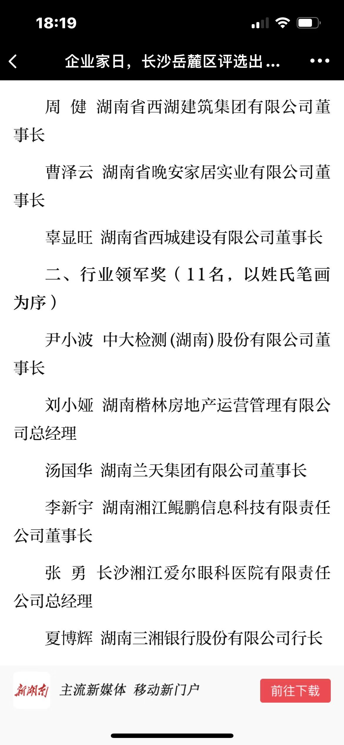在长沙市岳麓区,民营经济贡献了70%以上的经济总量、75%以上的税收、90%以上的企业数量,民营企业家成为当之无愧的城市建设推动者、城市精神引领者。11月1日,在长沙市首个“企业家日”,长沙市岳麓区委、区政府发表《致全区民营企业家的一封信》,并在全区范围内评选公布了30位“卓越企业家”。其中,我公司董事长尹小波教授被授予“行业领军奖”。