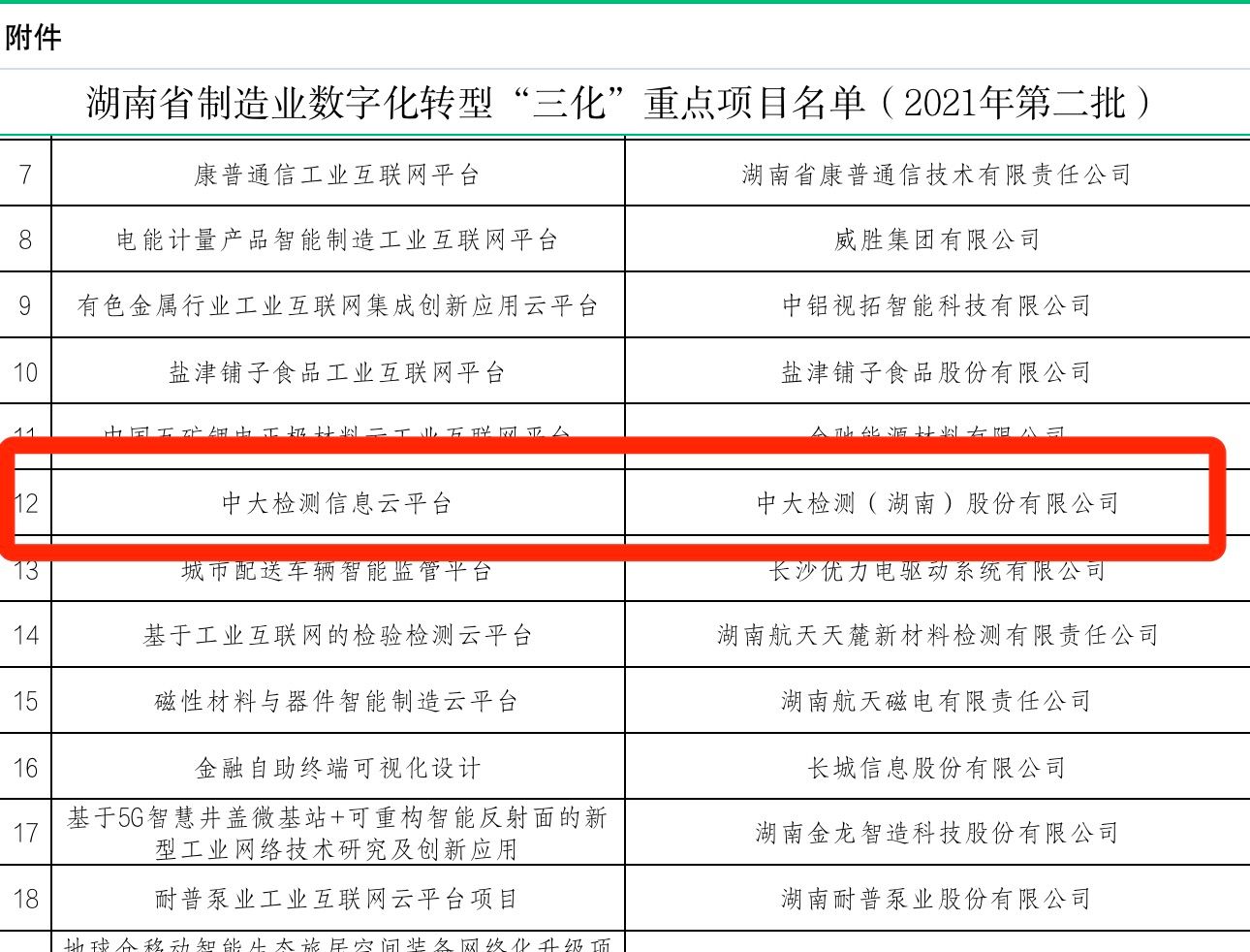 中大检测信息云平台入列《湖南省制造业数字化转型“三化”重点项目名单(2021年第二批)》