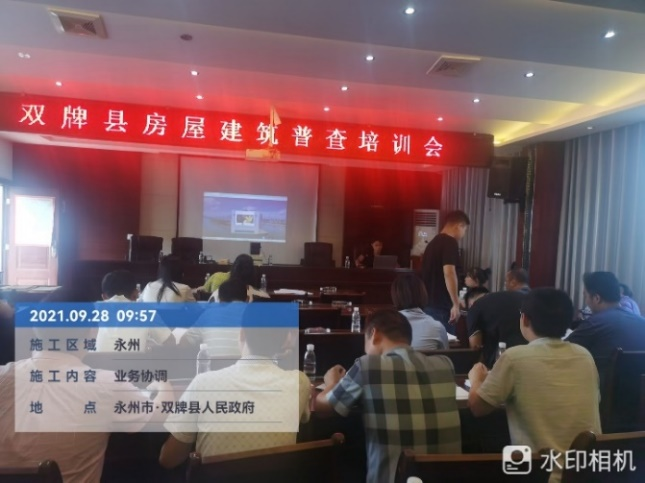 时间紧迫,当天,永州分公司受县住建局委托对各乡镇干部进行了普查前培训宣讲,当晚,本次任务负责人唐勇就此次普查培训任务展开分公司内部工作会议,对前期培训工作进行人员安排和任务分配,就培训内容和指标解释进行再一次的梳理和讲解,为可能出现的问题和难点探讨解决方法。次日,5个小组20个技术员,散作满天星,从冷水滩奔赴双牌县各乡镇对调查员进行培训指导,在9月29日到30日两天内完成整个双牌县的初步培训。