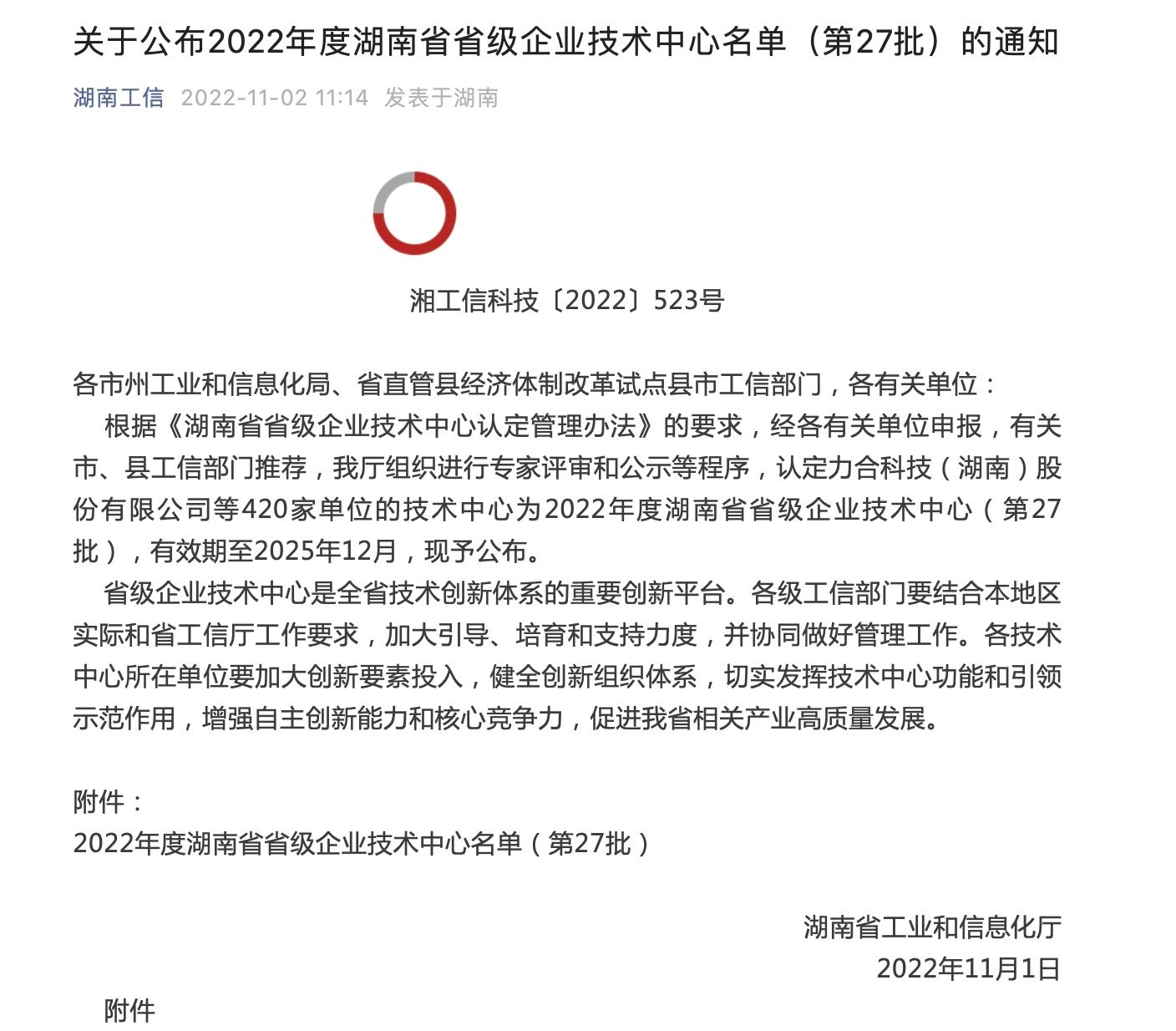 11月1日,湖南省工业和信息化厅公布了2022年度湖南省企业技术中心名单,中大智能科技股份有限公司荣列其中。