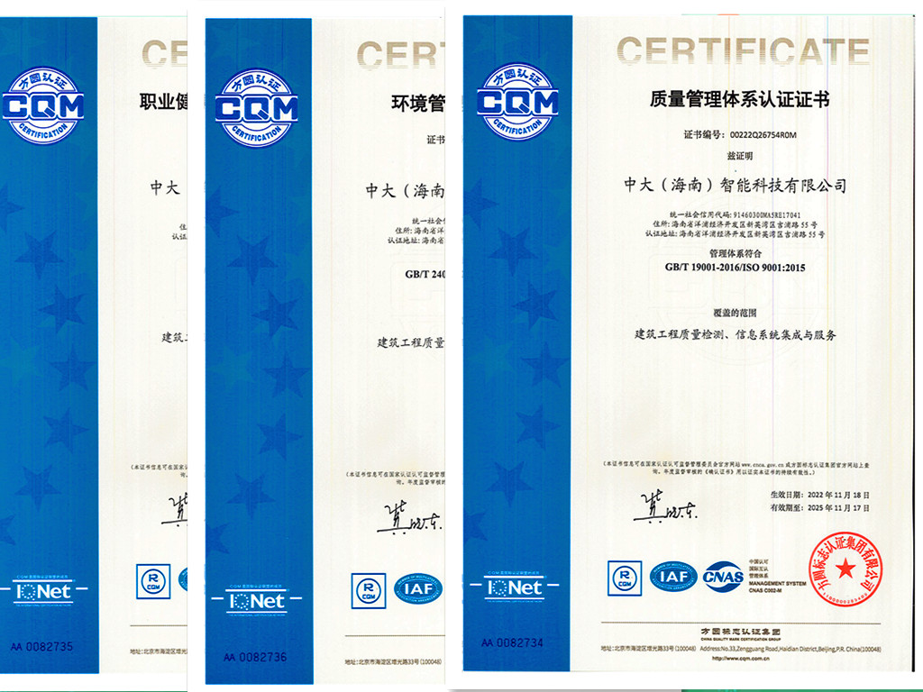 近日,中大(海南)智能科技有限公司顺利通过ISO“三体系”(质量管理体系、环境管理体系、职业健康安全管理体系)认证,取得了方圆标志认证颁发的三体系认证证书。