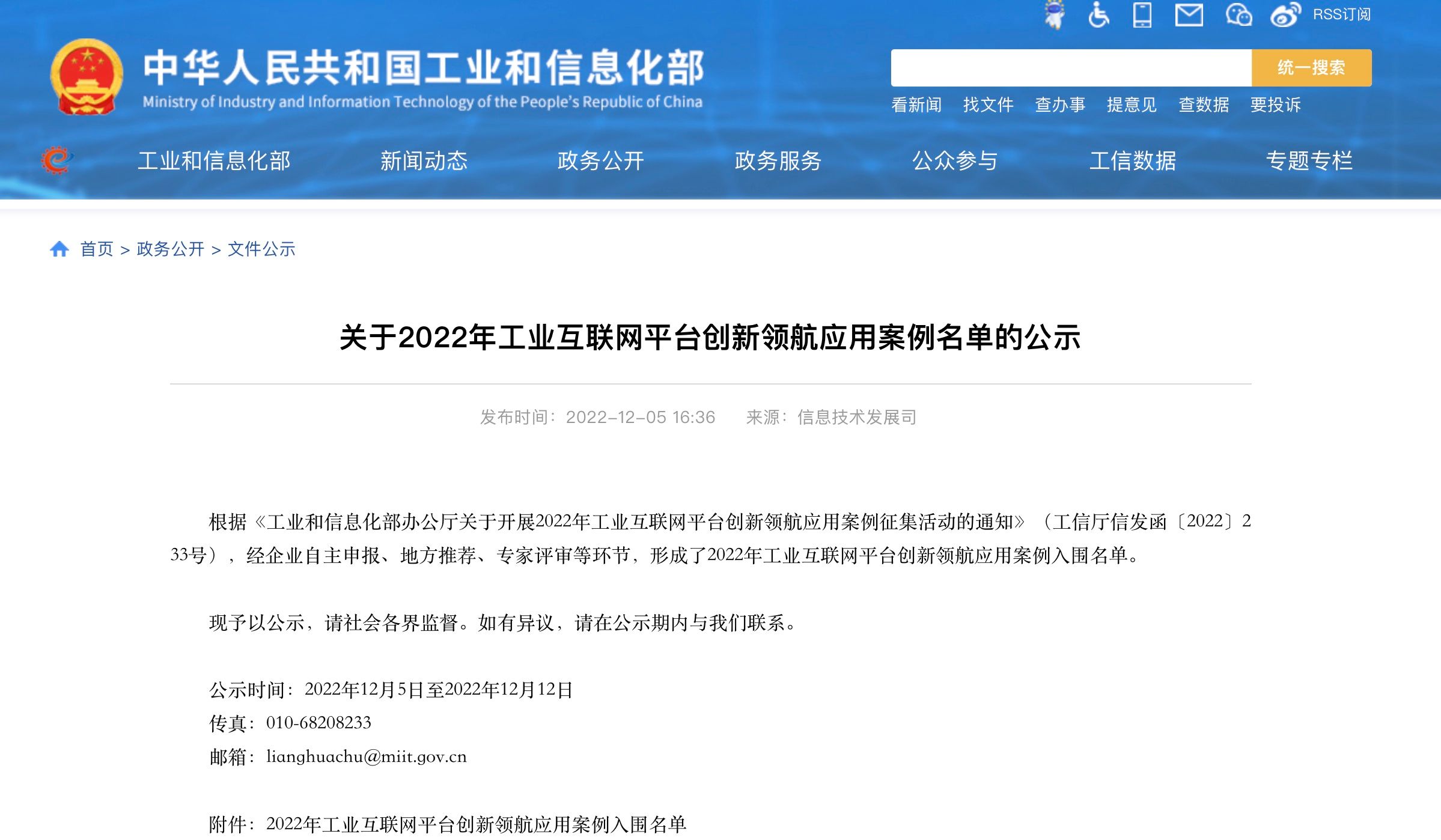 2022年12月,工信部公示了2022年工业互联网平台创新领航应用案例入围名单,由中大科技自主研发的《基于工业互联网的水利工程数字化管理创新应用》成功入选。