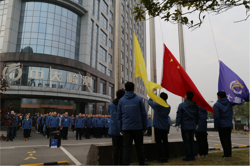 随着升旗手踏着坚定而整齐的步伐入场,雄壮的《义勇军进行曲》奏响,在场全体员工肃穆而立,心潮激动,目送鲜艳的五星红旗冉冉升起。