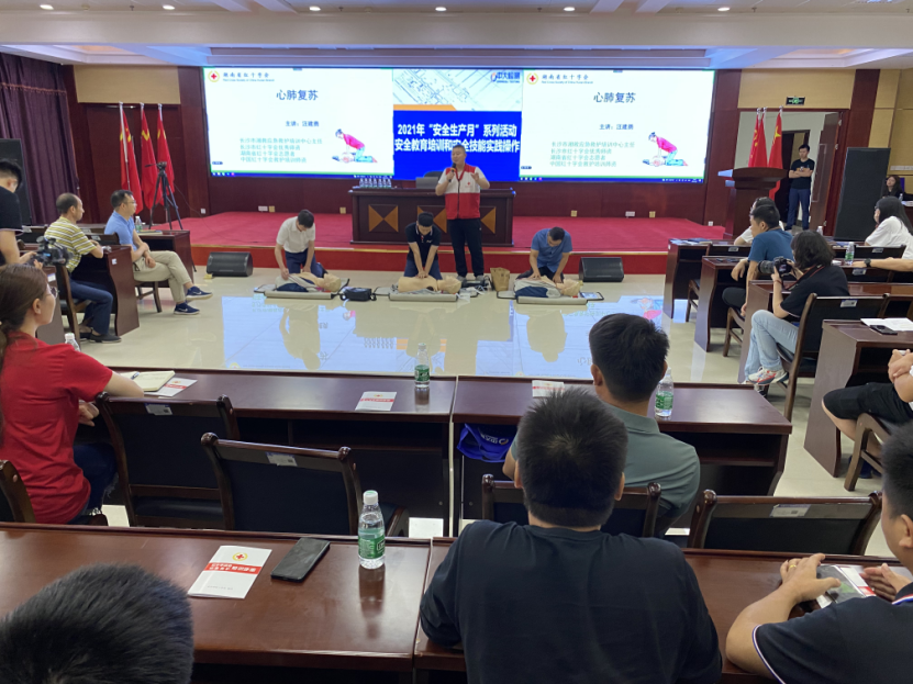 接着开展了应急救援处置技能实践操作培训。公司邀请长沙市湘救应急救援培训中心汪建勇教官团队做关于常见急诊、心肺复苏、气道异物梗阻等课程培训。培训中,汪教官采用多媒体展示及案例分析、现场示范、互动等多种方式,着重讲解了现场紧急救护必须掌握的基本要领和注意事项,对如何判断伤员意识、伤员身体躺卧的正确位置和人工呼吸等做了现场演示,并让参训员工逐一模拟操作。