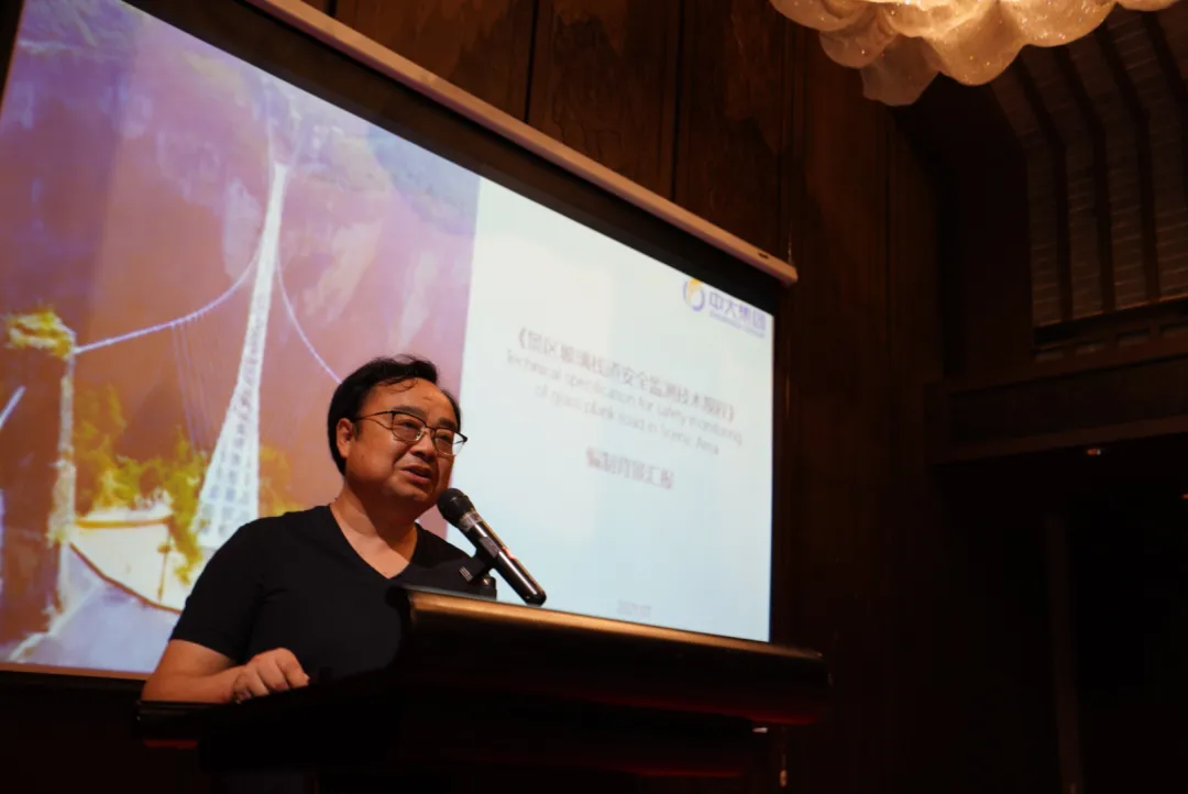 田代亮总监从任务来源、栈道工程发展历程、玻璃栈道现状分析、编制本规程的目的及必要性概述、背景和意义、编制原则、主要技术难点与需调研的主要技术问题等七个方面,对标准进行编制背景汇报。田总监表示,该标准可为景区人行玻璃桥及玻璃栈道工程从设计、施工、运营的全过程配套完善安全监测设施技术要求,推进数字化监管、智能监测设备设施、智慧监测技术、监测数据质量控制及其可追溯性、监控系统数字化运营和评价提供技术和管理依据,确保景区人行玻璃桥及玻璃栈道设施实施智慧监控,满足规范化、可溯化、数字化、融合化和智能化的“五化”要求。