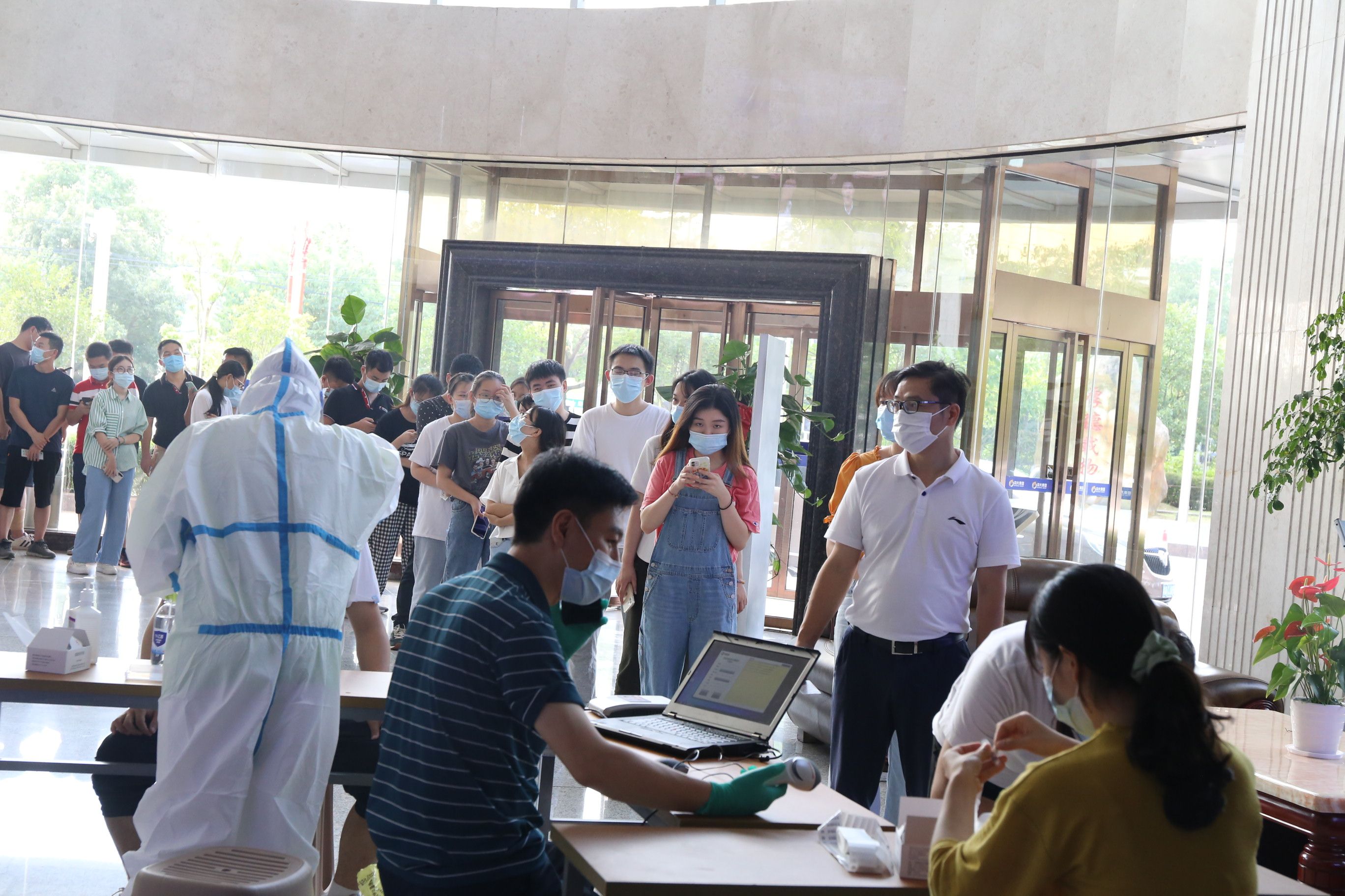 厚厚防护,遮挡不了抗疫工作者认真负责的工作态度。正是八月酷暑季节,即便在空调大厅,穿着防护服的白衣天使小姐姐也早已是汗流浃背,疲惫不已,但只要有一个员工出现在检测处,她便站起身,不顾额上滚落的汗珠,细心认真完成每一个人的检测流程。