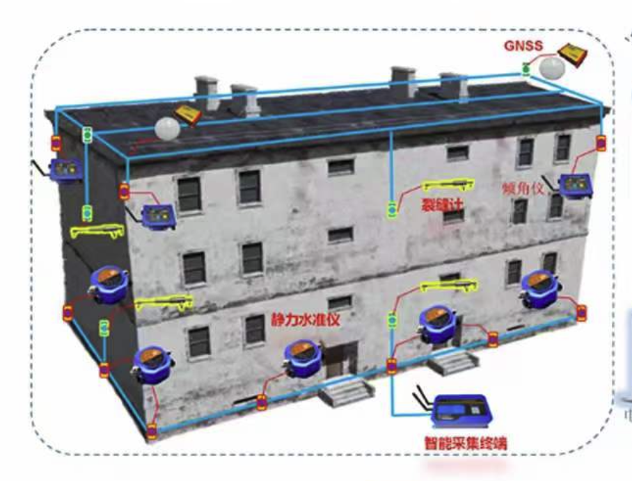 系统能准确跟踪老旧房屋的安全稳定状态,同时便于快速布设——通过无线倾角仪、无线位移计等传感器对建筑物倾斜、裂缝进行实时在线监测,并建立规范、统一的监测平台,集数据采集、传输、分析、信息共享、数据储存于一体,对建筑物进行动态观测,对其失稳作出预警,以评价建筑结构的长期稳定性和安全性。